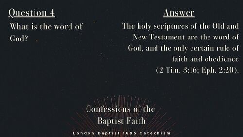 The catechism now more deeply explores the usage of the Word of God to reveal God to those He chooses. Question four tells us that the Word of God is Old Testament and New Testament. Though this is not explicitly said in the catechism, The 1689 London Baptist Confession of Faith declares both the Old and New Testaments are made up of the 66 books of the Bible that we currently hold to be Scripture. This is shown in detail in chapter one, section two.