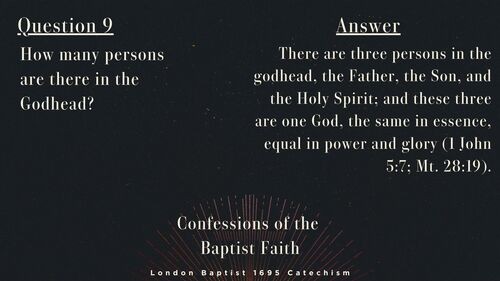 In Question 8, we discussed how God is one. He is one God that stands alone as our Sovereign. In Question 9, we see that our one God is multiple “persons”. Question 9 then requests, “How many persons are there in the Godhead?” The answer is plainly seen throughout the Scriptures and is concisely declared here in the catechism: “There are three persons in the godhead, the Father, the Son, and the Holy Spirit; and these three are one God, the same in essence, equal in power and glory."